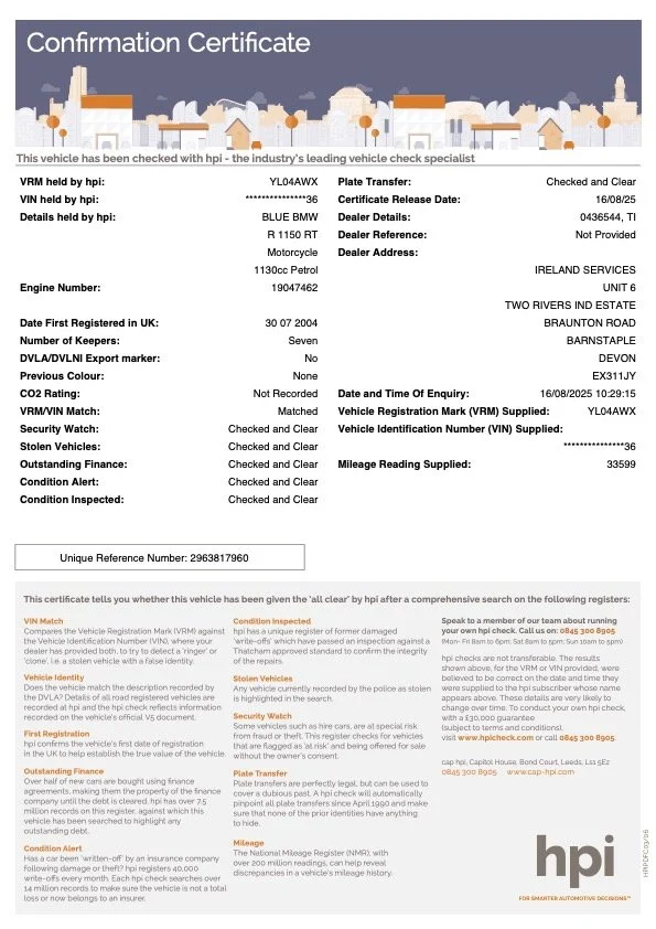 ** Visits to the showroom and vehicle Viewings by appointment only, please call/Whatsapp message 07749834653 or email tom@irelandsmotorcycles.com to book **